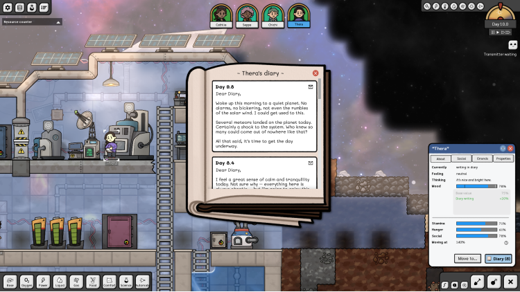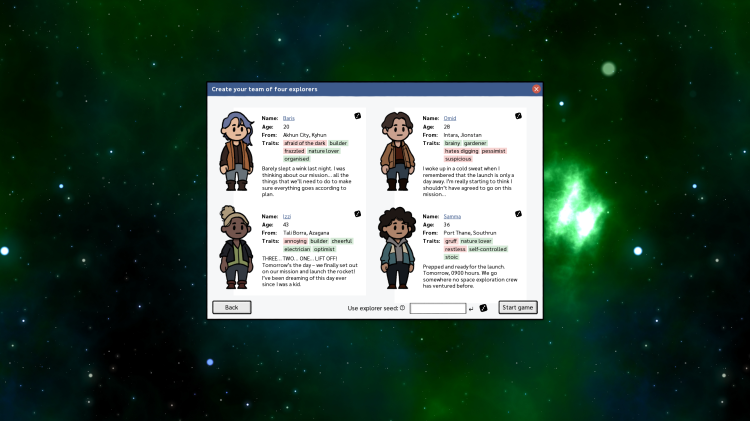 Each crew member is a distinct individual, generated procedurally at the start of each game. Your goal is to keep them alive: breathing, fed, warm, healthy, and happy. Each explorer has their own set of skills, traits, and opinions they will not hesitate to share with other crew members. Their conversations and diaries are an integral part of the story and the gameplay, helping you figure out how to best utilize their skills in a challenging environment.