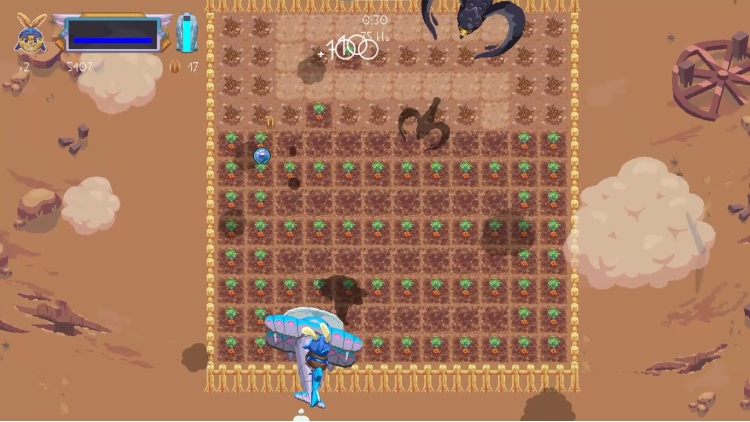 But there's more than just seeding and watering! As Captain Rabbo and her indomitable sidekick, Dirk Doggo, you’ll face wave upon wave of atrocious avian aggressors from the gluttonous Gale Gang! They fight to keep the land in a state of perpetual misery and desolation. Dodge, jab, and ram these formidable fowl, showing them that no matter what they try, your will to restore the landscape remains unbroken.