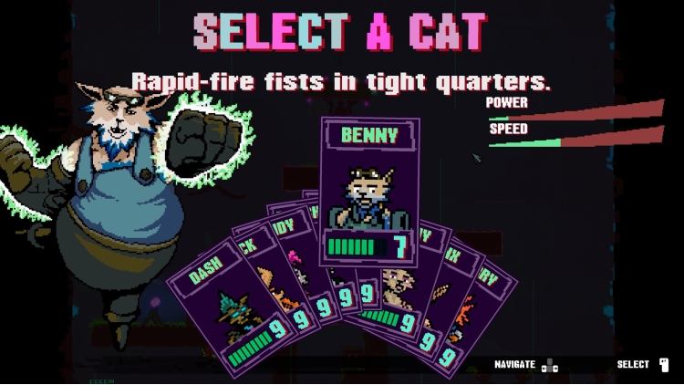 Choose from nine fierce cat characters, each boasting unique base stats, primary weapons, and powerful special attacks that recharge based on your performance (tracked by a combo counter). Roam through five distinct zones, the first four of which you can conquer in any order, each designed to challenge you with specific enemy types, from wide-open arenas for ranged combat to tight quarters for intense melee brawls.