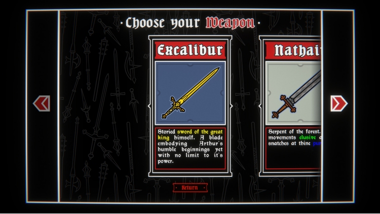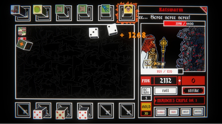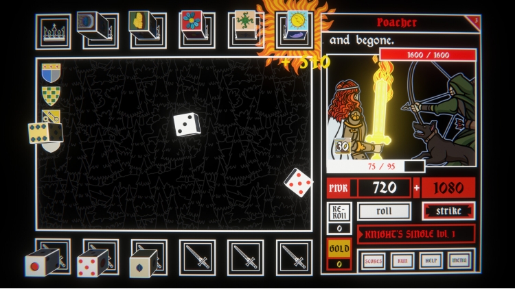 You’ll start each run with basic dice - visit shops in between your battles to acquire new ones and build up your set. Some dice can increase your odds of certain rolls, others multiply your scores (or might be a detriment, hope you have enough re-rolls to change that!) It’s up to you to find the perfect combinations to save King Arthur and smite his foes!