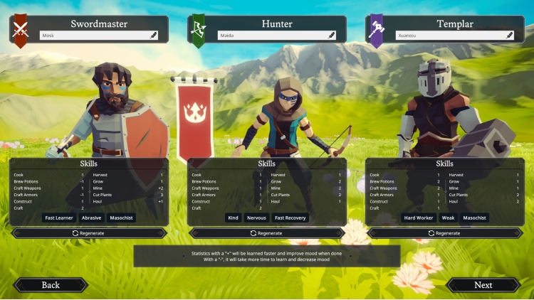 Inspired by classics of the genre but more accessible, manage a team of adventurers landing on a procedural island, and explore dungeons while taking care of their needs, moods, traits and social interactions.
