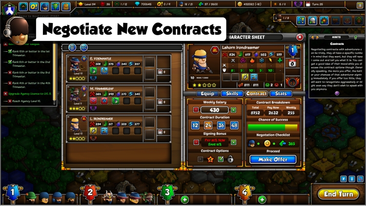 Adventurers are the backbone of your Agency. To find them, you’ll first need to organize recruitment campaigns across the Realm, then negotiate contract terms with those who present suitable talents, traits and growth potential!