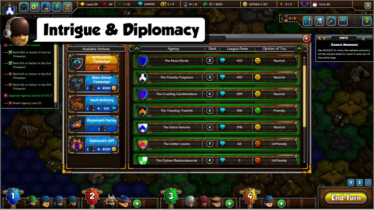 Send agents on the field to prospect new job opportunities, scout the dangers ahead, recruit new adventurers, negotiate their contracts, organize them in parties and complete dangerous quests to earn more fame than your rivals and climb the rankings of the League Ladder!