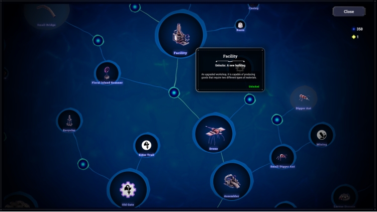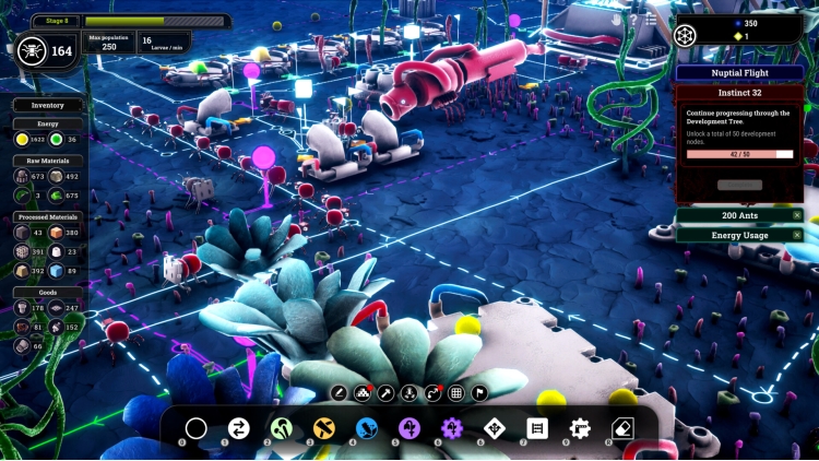 Use trails and buildings to create instructions for your ants. Collect materials, produce goods and feed the queen.