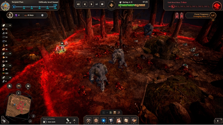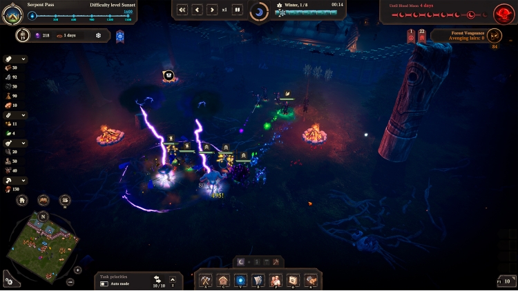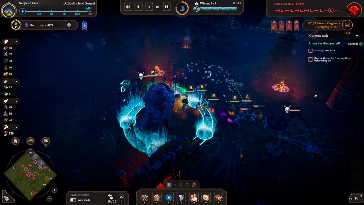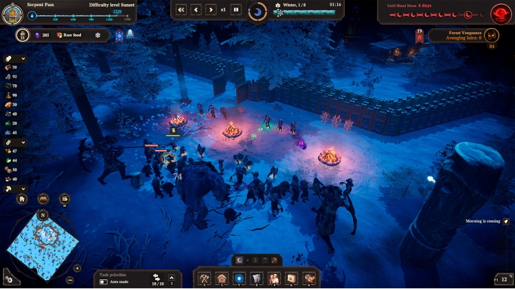 The nights grow increasingly longer and colder, but snowstorms and penetrating frost are not your only enemies... Portals open everywhere, allowing Prince Velimir's servants to hunt down the survivors. The longer you stay in one place, the stronger the Darkness grows and more ruthless the nights become: with every house built, with every lair destroyed the pressure of the woods only gets worse. Ghouls, Leshies, Werewolves, and Night Hags are only some of the creatures that will try to destroy your settlement. You'll have to defend your land against monsters and defeat their Baron so that you are able to move to new lands.