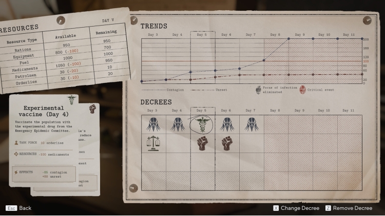 Fight for every new day. Ensure the town's survival by imposing your own rules: enforce quarantines, confiscate precious medicine, vaccinate the population, suppress riots, deploy patrols, and declare curfews.
