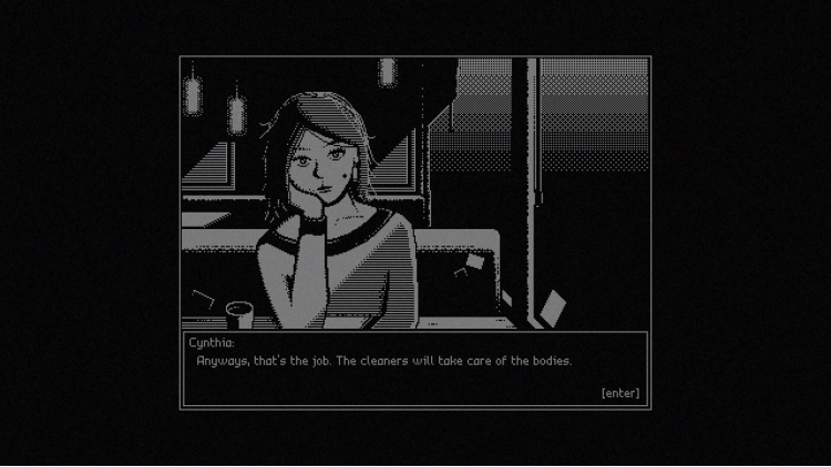It's your first day at [the company.] You've been tasked with recovering damaged oxygen tanks scattered throughout the facility. Don't ask what they're for. Don't ask where they came from. Aaron used to do the same job. Don't ask about Aaron. Focus on Cynthia: She's kind to you, isn't she? Doesn't she care?