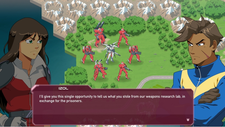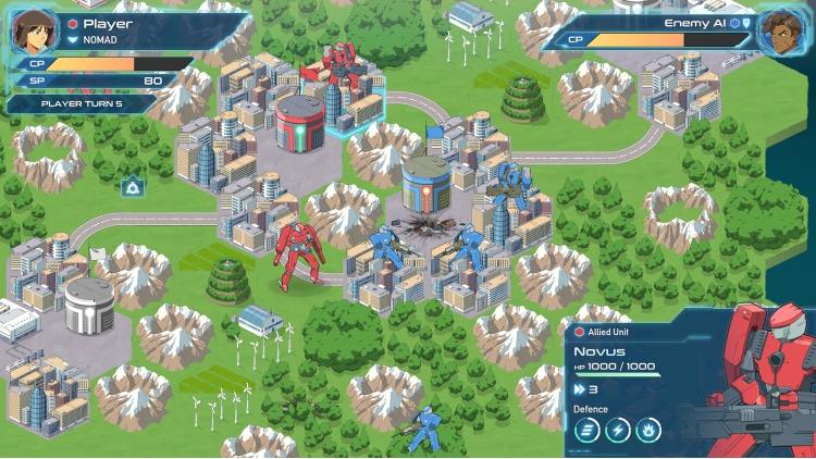Choose from four commanders, each representing a different faction and bringing with them their own unique power, traits and play style. Think tactically as you move your units, clash with rival mecha, and watch the outcome in dramatic battle sequences inspired by 90s Japanese animation.
